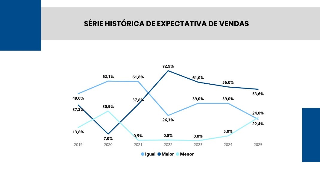 Do lado do comércio, o estudo mostra comportamento misto: 53,6% dos lojistas acreditam que as vendas serão maiores do que as do ano passado; 24% projetam vendas menores e 22,4% esperam um desempenho similar. Observa-se uma tendência de menor otimismo desde 2022 na série histórica de expectativas. Entre os que esperam queda, 84,3% indicam a crise econômica como principal causa. Já os lojistas otimistas destacam a possibilidade de impacto positivo da data sobre o desempenho das vendas (26,1%).