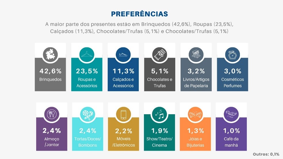 Quanto às preferências de compras, os brinquedos aparecem em primeiro lugar (42,6%), seguidos por roupas (23,5%), calçados (11,3%), chocolates e trufas (5,1%), livros ou artigos de papelaria (3,2%) e cosméticos (3%). A maior parte das compras para o Dia das Crianças devem ser feitas em lojas físicas, de rua/bairro, e shoppings, que, juntas, representam aproximadamente 66,2% das escolhas.
